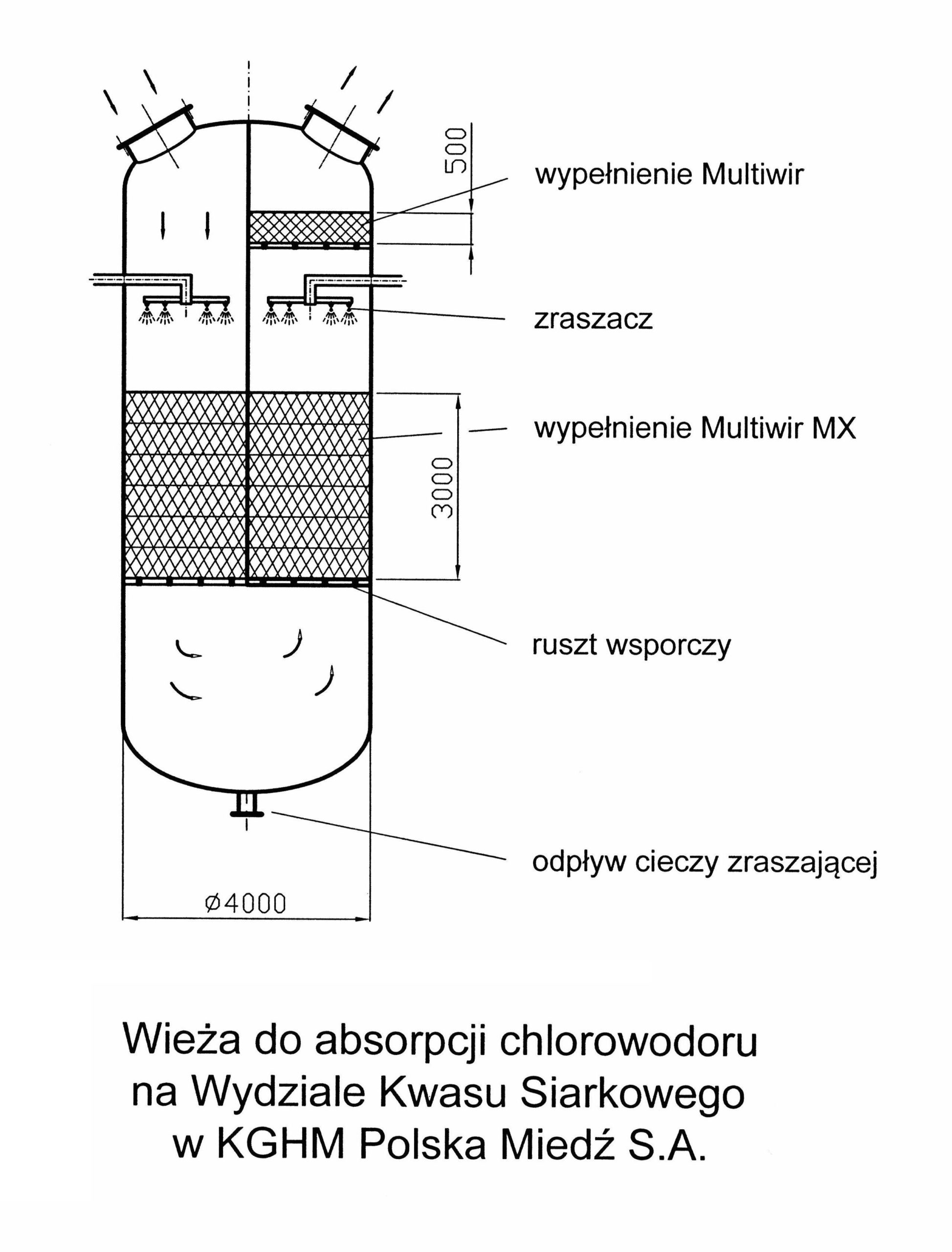 Dodatkową zaletą wypełnienia Multiwir MX jest duża trwałość i wytrzymałość mechaniczna. Przykładem zastosowania wypełnienia Multiwir MX jest instalacja absorpcji chlorowodoru działająca od 1995 r w Hucie Miedzi Legnica na wydziale kwasu siarkowego. Dwa identyczne aparaty pracujące równolegle są częścią instalacji Solinox do odsiarczania spalin. Każdy aparat jest cylindryczną kolumną podzieloną pionową przegrodą na część współprądową i przeciwprądową. Obie części są wypełnione i wyposażone w dysze zraszające. Łączna wysokość warstwy wypełnienia Multiwir MX do absorpcji w każdym z obu aparatów wynosi 6m. Część przeciwprądowa zawiera ponadto odkraplacz w postaci standardowego wypełnienia Multiwir umieszczonego na szczycie.