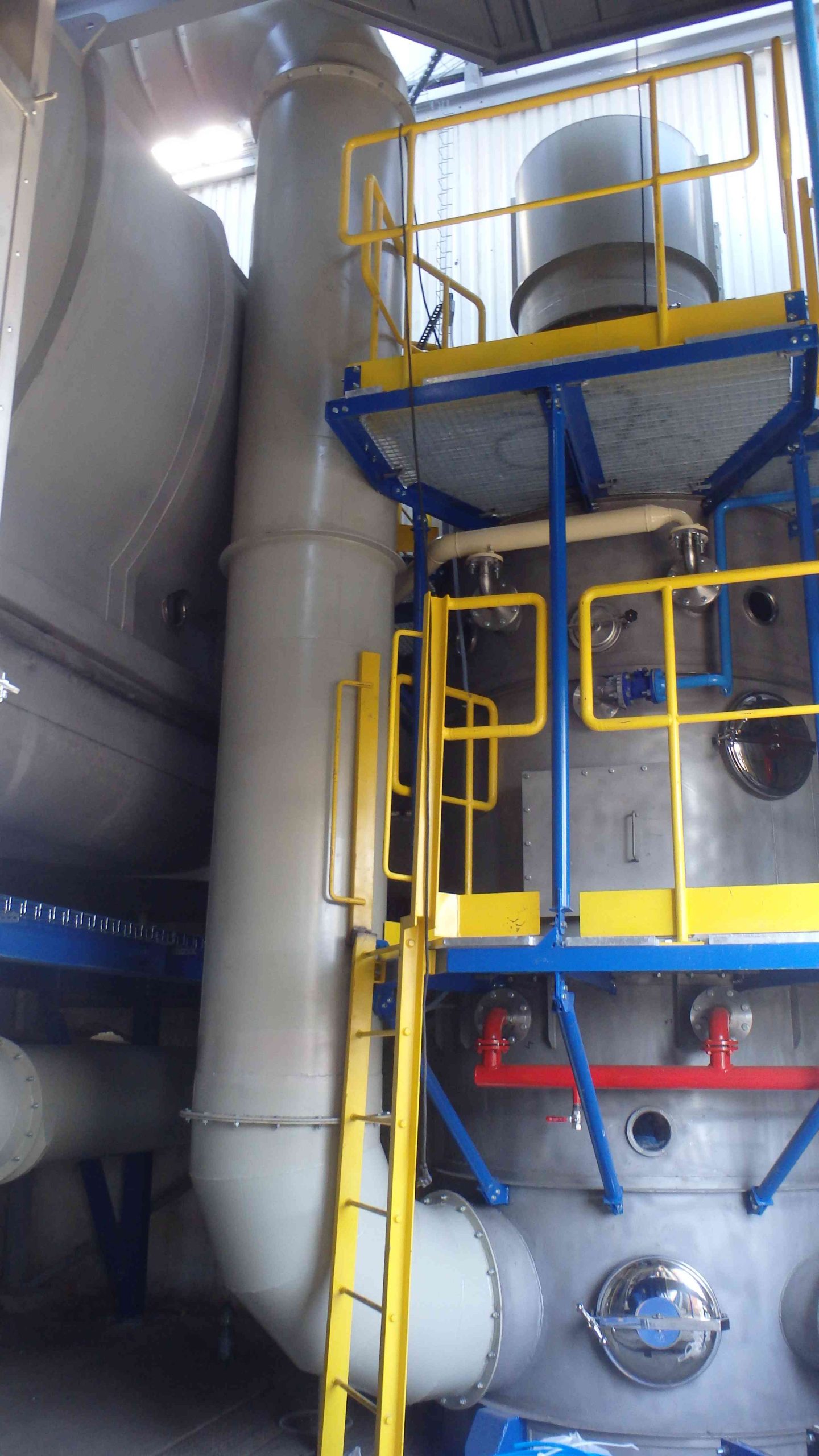 The apparatus is equipped with two sets of Multiwir packing made of polypropylene and placed on grates in the middle and upper part of the apparatus. The lower part of the scrubber is a circulating tank with overflow, connected to a pump and a system for automatic regulation of the sugar concentration in the circulating liquid.